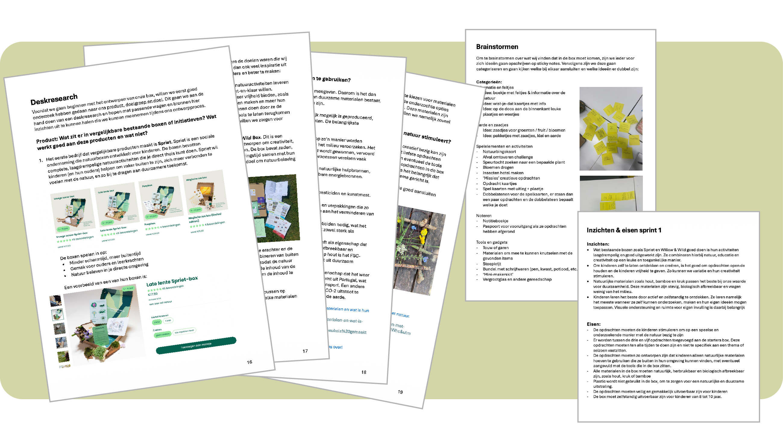 In de onderzoeksfase zijn we gestart met een deskresearch naar bestaande boxen en vergelijkbare concepten. Hierbij keken we naar welke producten hierin zaten, wat goed werkte en wat wij beter konden doen. Daarnaast bekeken we welke materialen verantwoordelijk en duurzaam waren om te gebruiken. Ook richtten we ons op het doel en de doelgroep en onderzochten we welke activiteiten creativiteit kan stimuleren in de natuur en hoe kinderen uit groep 5 en 6 leren. Op basis van deze inzichten en eigen ideeën zijn we gaan brainstormen over de inhoud van de box. De uitkomsten van ons onderzoek hebben we verwerkt in inzichten en eisen die belangrijk waren voor het verder ontwerpen van onze box.