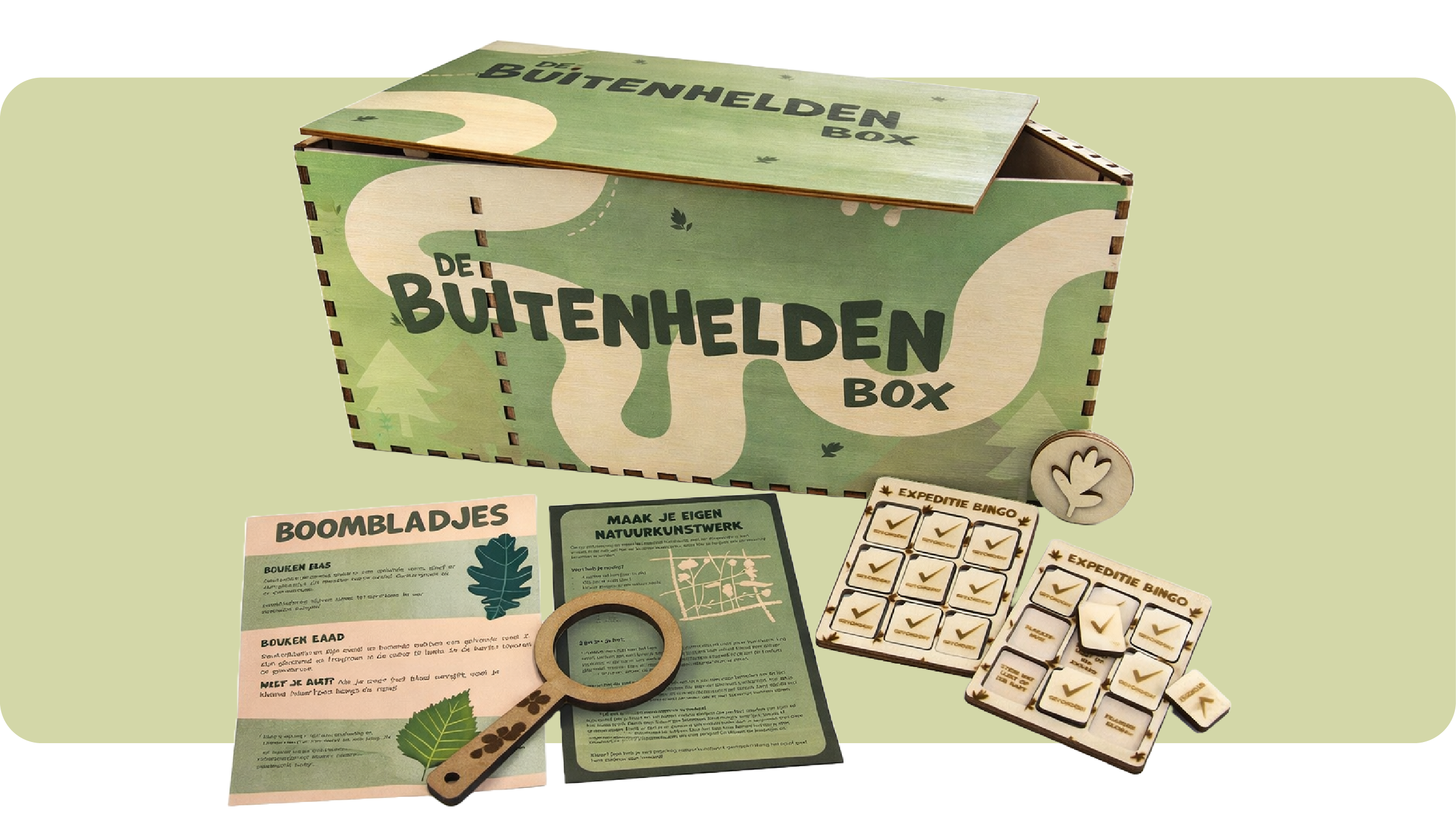 Het eindresultaat van ons project is de Buitenhelden Box, een avontuurlijke box voor kinderen van 8 tot 10 jaar die hen stimuleert om naar buiten te gaan en de natuur te ontdekken. In de box zitten leuke opdrachten en handige tools waarmee kinderen zelfstandig mee op pad kunnen gaan. Spel, leren en creativiteit komen samen terug in de box. We willen hiermee kinderen op een laagdrempelige en speelse manier meer tijd buiten laten doorbrengen en hun nieuwsgierigheid prikkelen.
