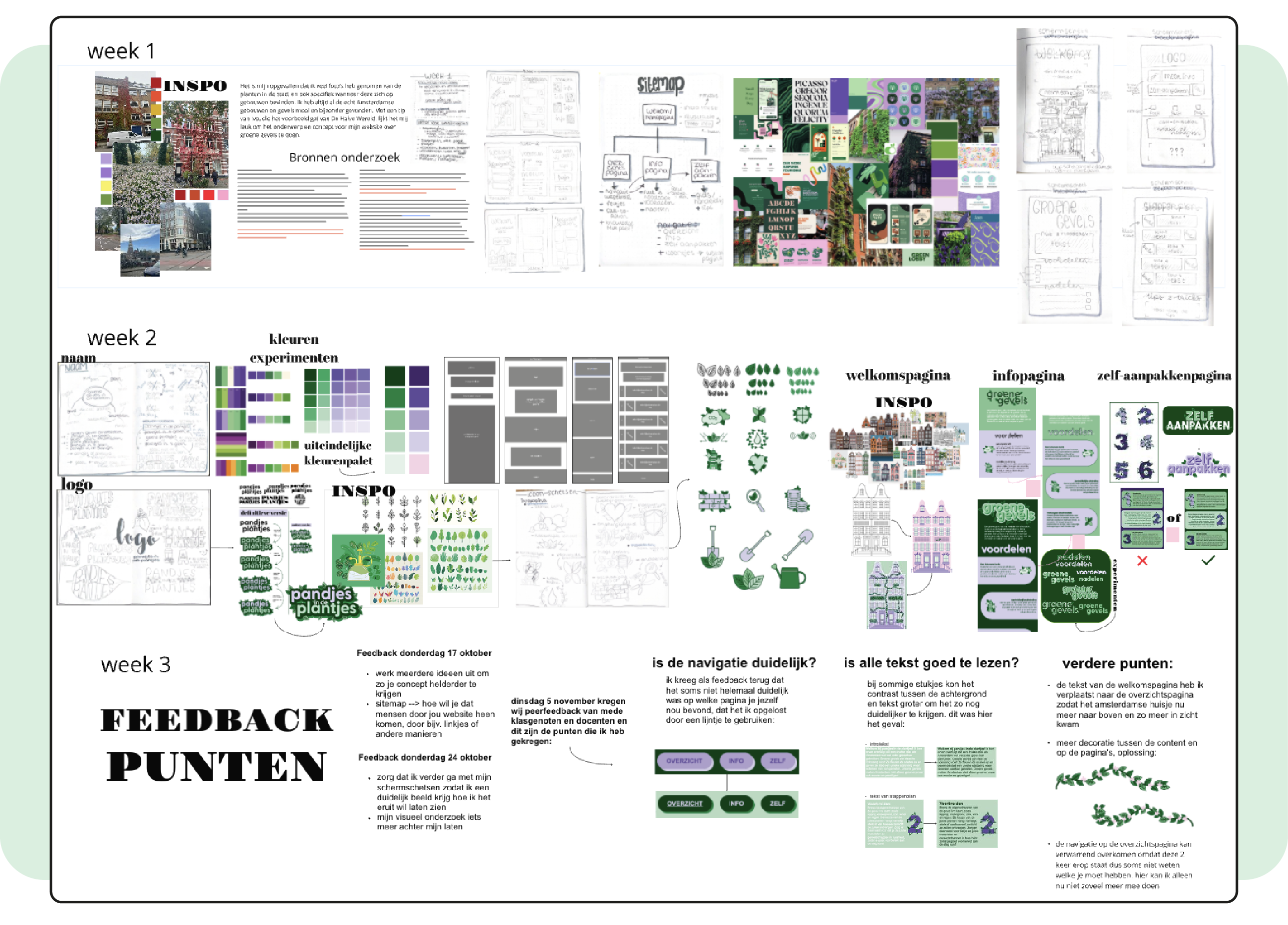 In de onderzoeksfase heb ik inspiratie opgedaan door de stad in te gaan, foto's te maken en onderzoek te doen naar kleine duurzame initiatieven in Amsterdam. Daarbij viel het mij op dat ik veel foto's had gemaakt van planten en begroeiing op gebouwen, vooral op typisch Amsterdamse panden. Vanuit hier is het idee ontstaan om te focussen op groene gevels.