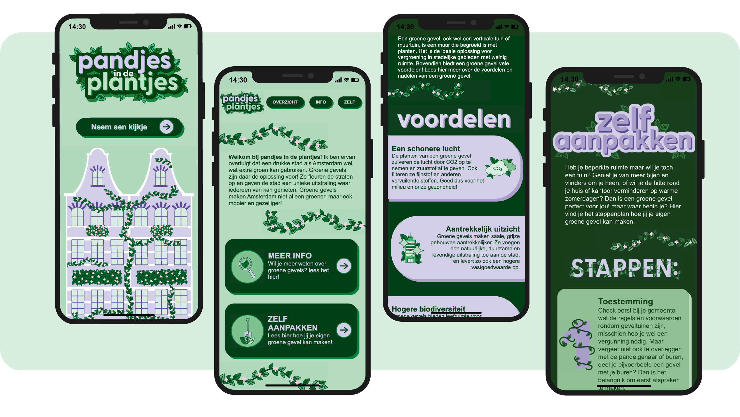 Voor project De Lieve Groene Stad ben ik aan de slag gegaan met een mobiele website waarin groene gevels centraal staan: Pandjes in de Plantjes. Ik ben er namelijk van overtuigd dat een drukke stad als Amsterdam wel wat extra groen kan gebruiken. Groene gevels zijn hier de oplossing voor! Op de website vind je meer informatie over groene gevels, lees je over de voordelen en nadelen, en krijg je tot slot een stappenplan waarmee je zelf aan de slag kunt met het maken van een groene gevel.