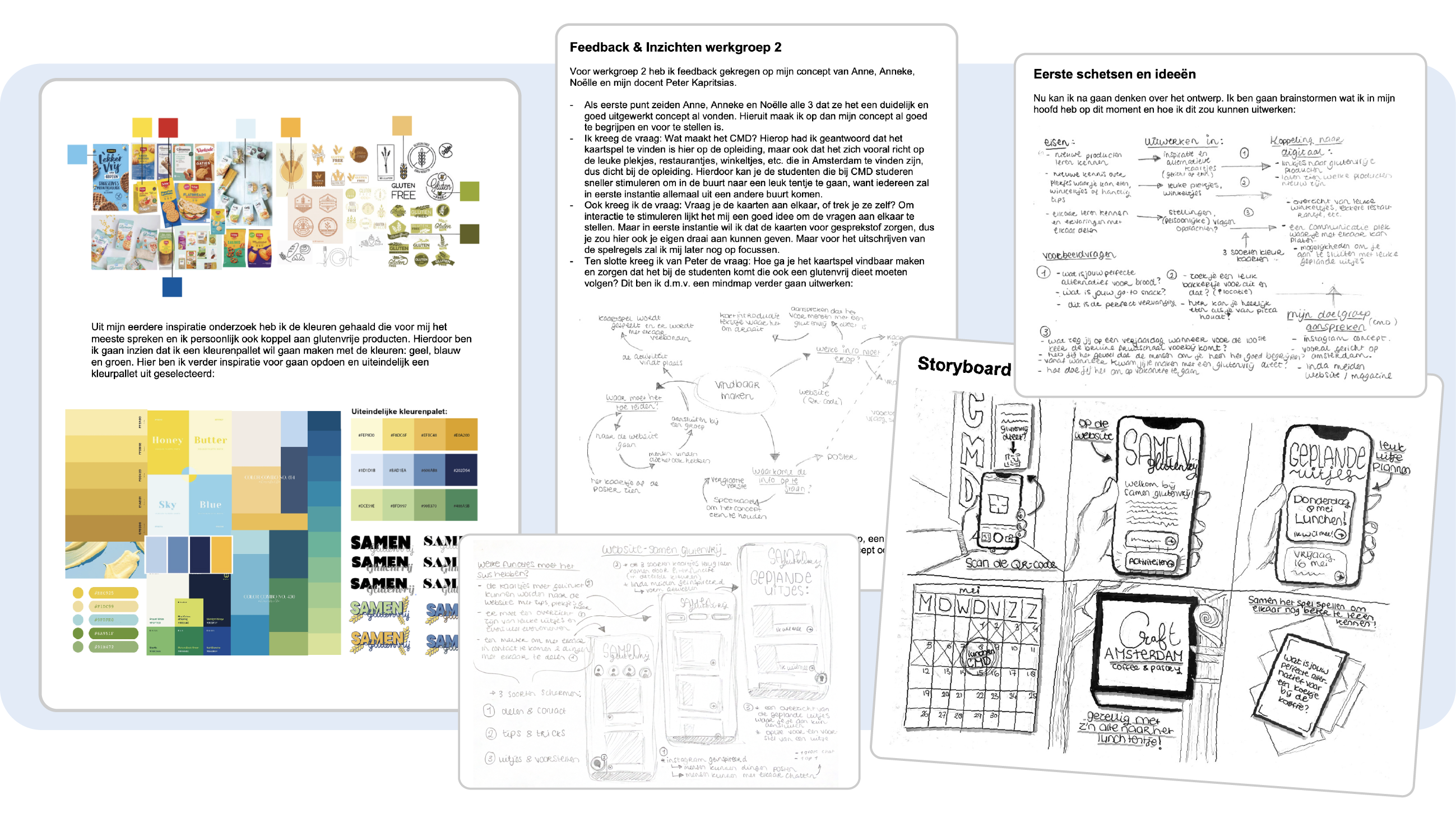 Op basis van mijn onderzoek ben ik begonnen met het schetsen van ideeën. Uiteindelijk koos ik voor het concept van een kaartspel in combinatie met een website. Ik vernieuwde de empathie map, maakte een storyboard en deed aanvullend onderzoek. Daarnaast werkte ik de vormgeving verder uit die aansloot bij de sfeer van glutenvrije producten en een positieve uitstraling. Deze ontwerpkeuzes en gekregen feedback van docenten en klasgenoten, verwerkte ik in nieuwe schetsen om het concept verder te verbeteren.