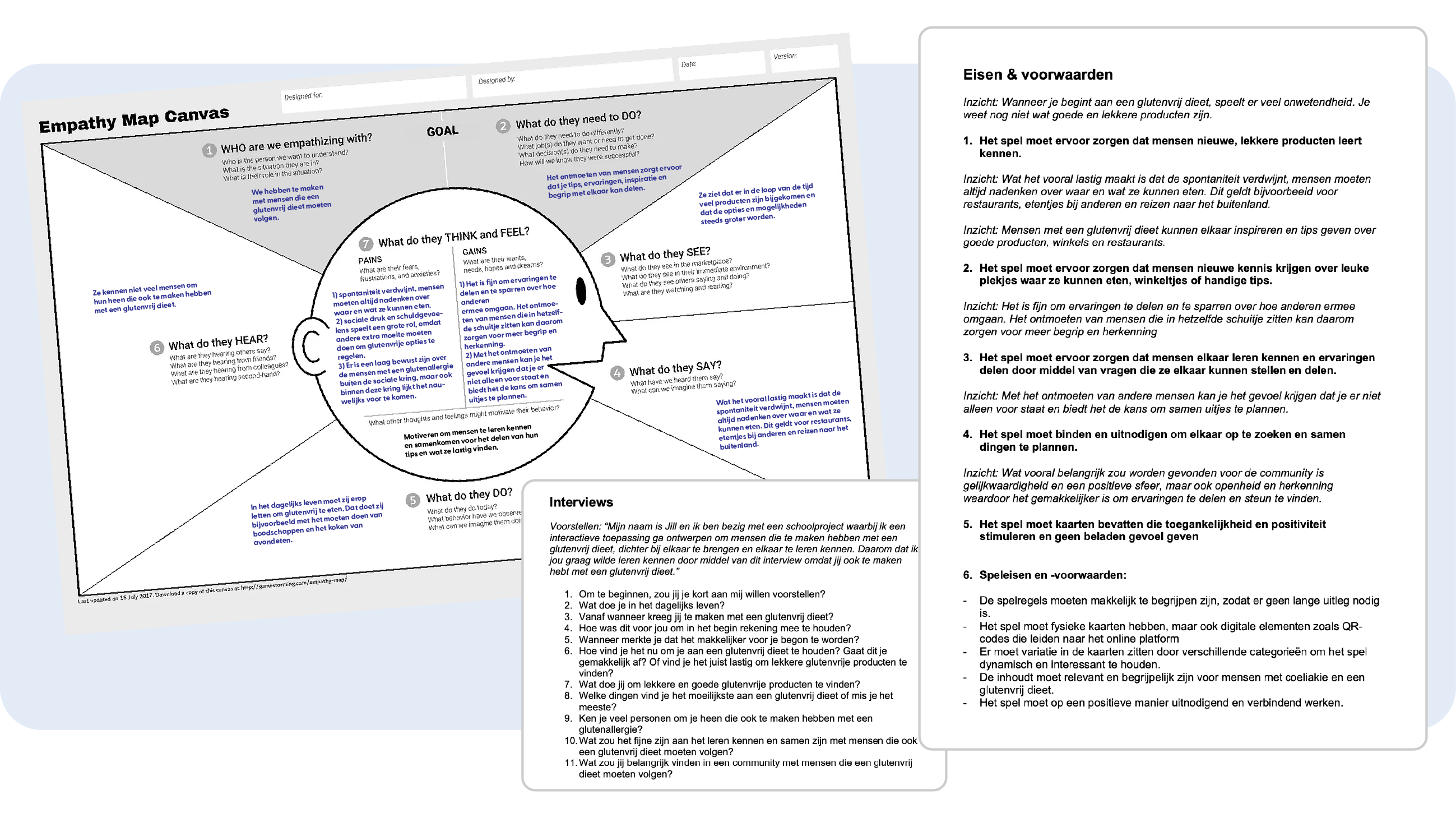In de deze fase ben ik begonnen met het doen van onderzoek en met het kennismaken met de community. Ik heb hiervoor interviews afgenomen met mensen die een glutenvrij dieet volgen, om zo inzicht te krijgen in wat hun uitdagingen, behoeften en wensen zijn. Hieruit bleek het vooral lastig te zijn dat de spontaniteit verdwijnt, dat sociale druk een rol speelt en dat het fijn is om ervaringen en tips te delen met mensen die in hetzelfde schuitje zitten. Deze inzichten heb ik vertaald naar belangrijke eisen en voorwaarden die ik tijdens het gehele ontwerpproces heb meegenomen. Daarnaast heb ik een empathie map gemaakt, onderzoek gedaan naar de context en inspiratie verzameld voor mijn ontwerp.