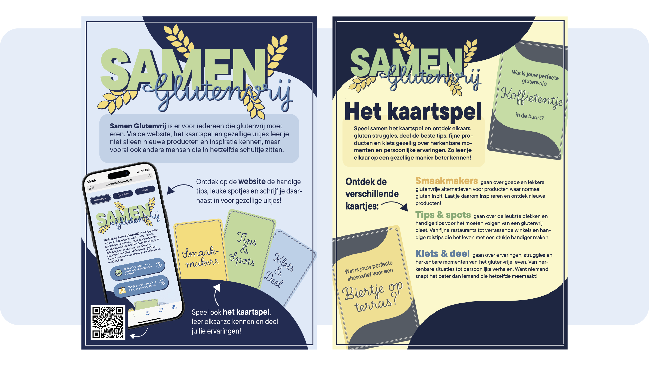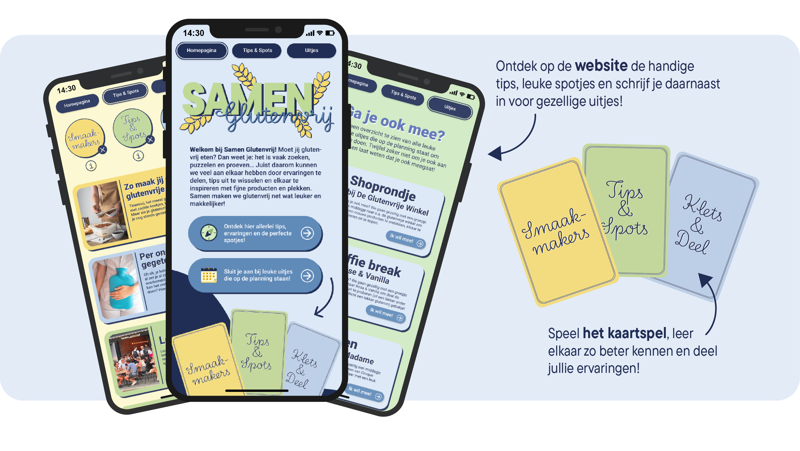 Mijn eindresultaat van dit project is Samen Glutenvrij, een concept dat mensen met een verplicht glutenvrij dieet inspireert, ondersteund en met elkaar verbindt. Het kaartspel stimuleert om in gesprek te gaan, ervaringen te delen en tips uit te wisselen. Daarnaast zorgt de website voor extra informatie, inspiratie en biedt het de mogelijkheid om deel te nemen aan geplande uitjes. Zo creëert het concept een community waarin mensen die in hetzelfde schuitje zitten samenkomen en hun ervaringen en tips kunnen delen. Ik heb dit project persoonlijk gemaakt, omdat ik zelf ook last heb van coeliakie.