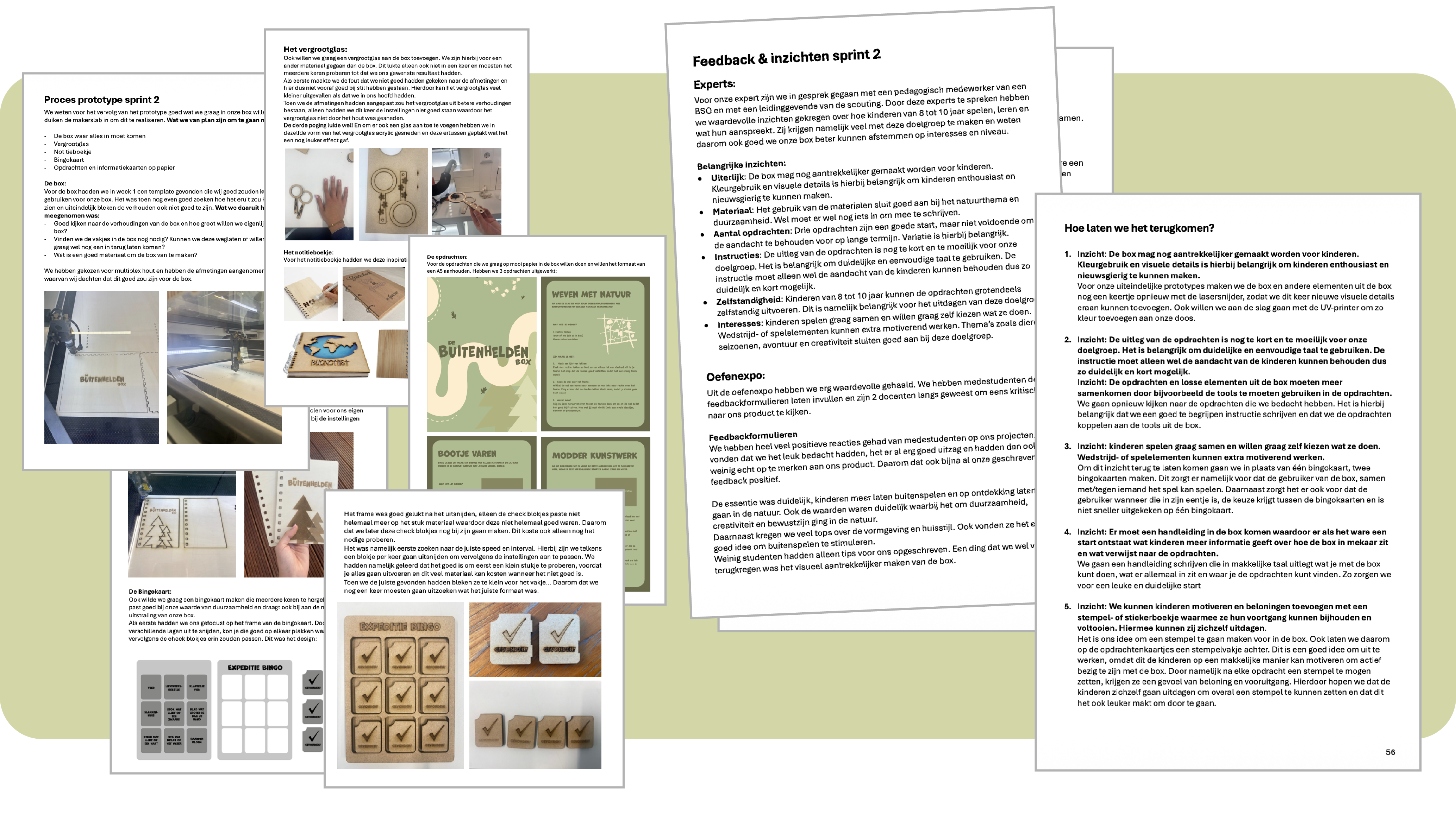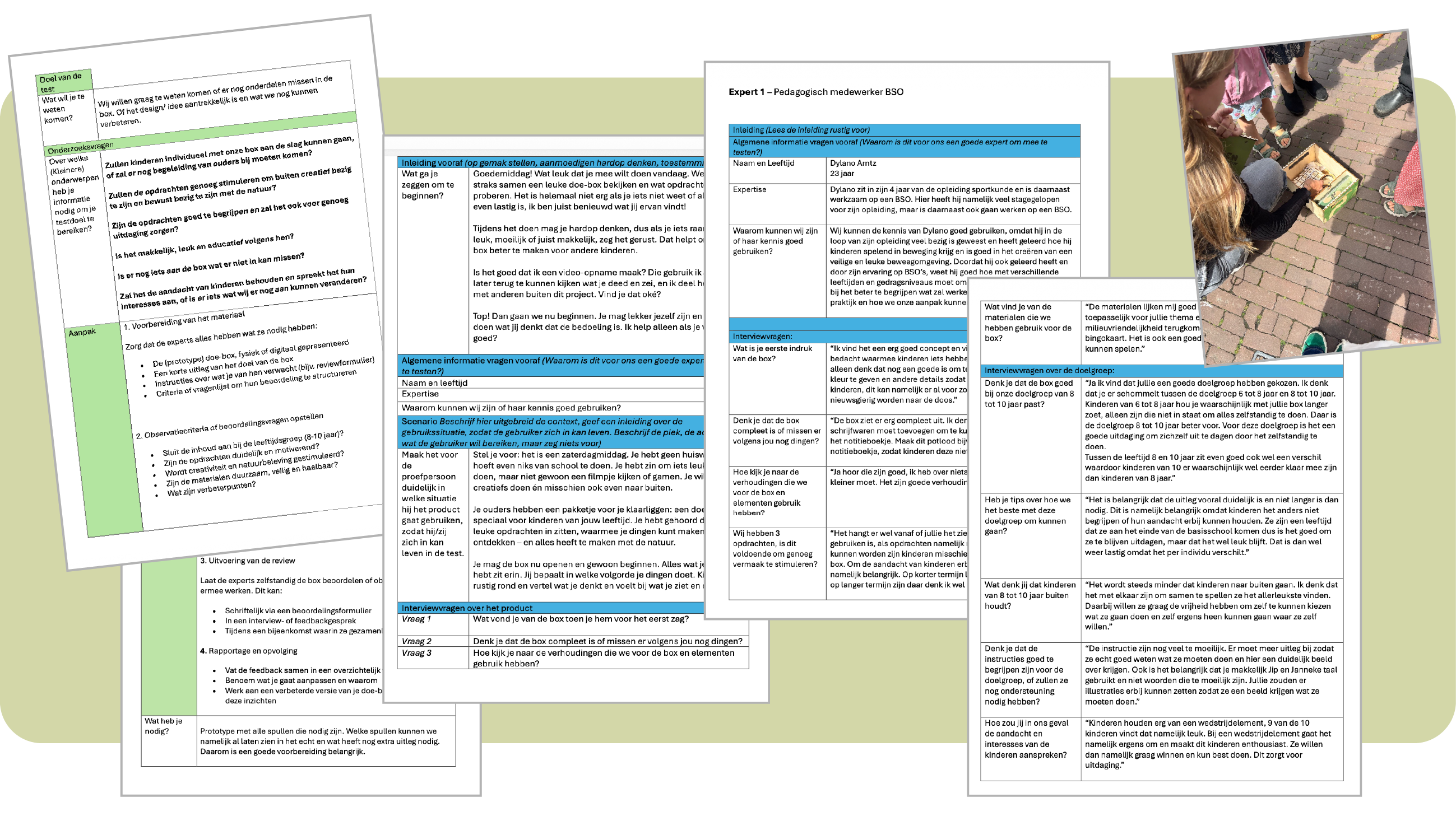 We presenteerde het prototype aan twee experts, een pedagogisch medewerker van een BSO en een leidinggevende van de scouting. Zo onderzochten we of de opdrachten duidelijk en leerzaam waren, of kinderen ook zelfstandig met de box aan de slag konden en of er nog dingen misten. Daarnaast was het ook belangrijk om met onze doelgroep te testen, omdat hun ten slotte de gebruikers van het product worden. Alle feedback van experts, kinderen, medestudenten en docenten verzamelden we en gebruikten deze inzichten om het concept en prototype verder te verbeteren.
