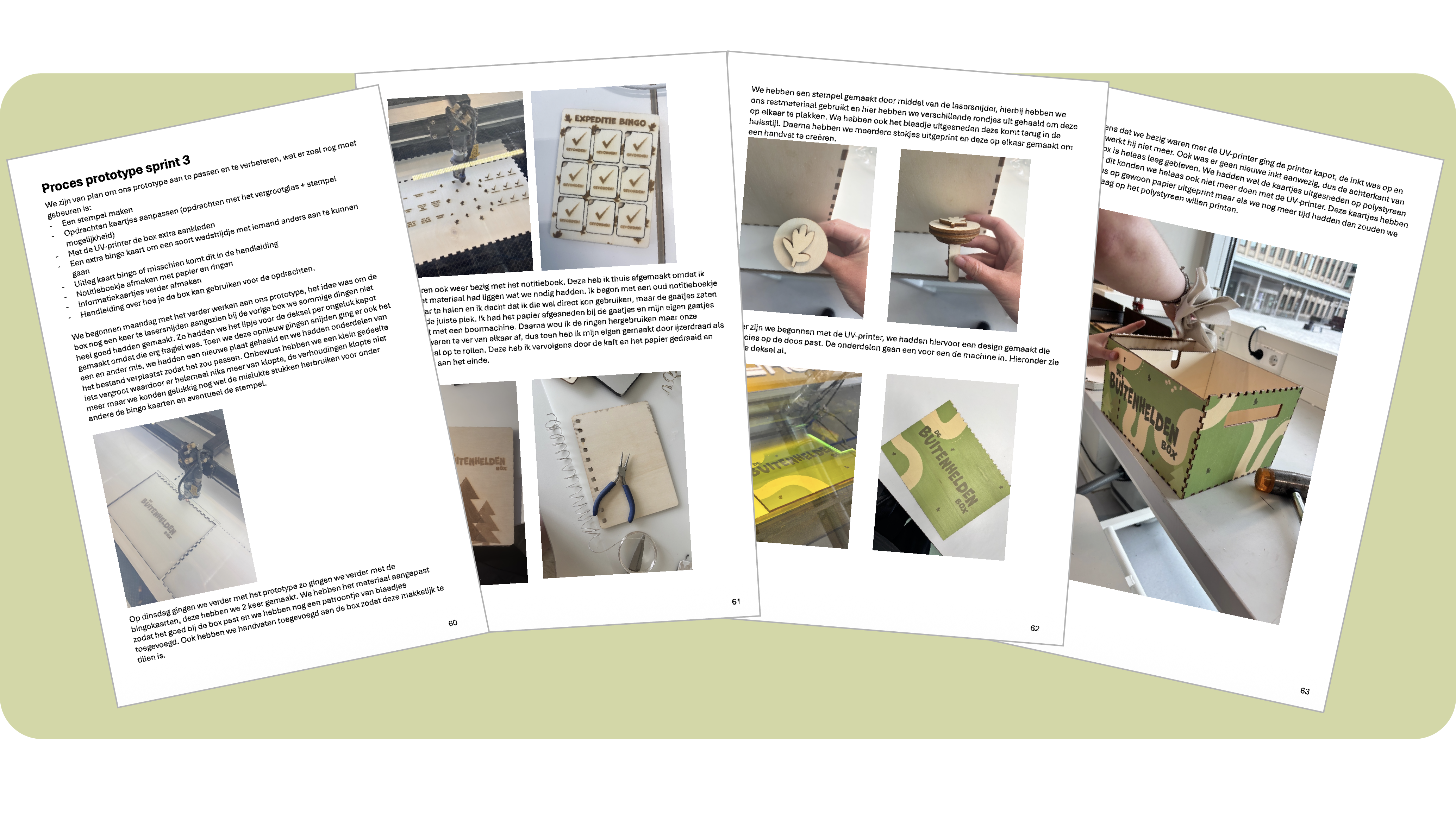 In de ontwerpfase lag de focus op het verbeterden van het prototype tot ons eindproduct. In dit ontwerpproces werkten we de box steeds verder uit en voegden we er nieuwe elementen aan toe zoals aangepaste opdrachtenkaartjes, extra bingokaart, informatiekaartjes en een handleiding. We experimenteerden met materialen en productie tools in het Makerslab, zoals lasersnijden en de UV-printer. Zo maakten we een stevigere box met handvatten en ontwierpen we een huisstijl om het product ook visueel aantrekkelijk te maken. Uiteindelijk groeide ons ontwerp stap voor stap uit tot een compleet product waarin alle onderdelen samenkomen.