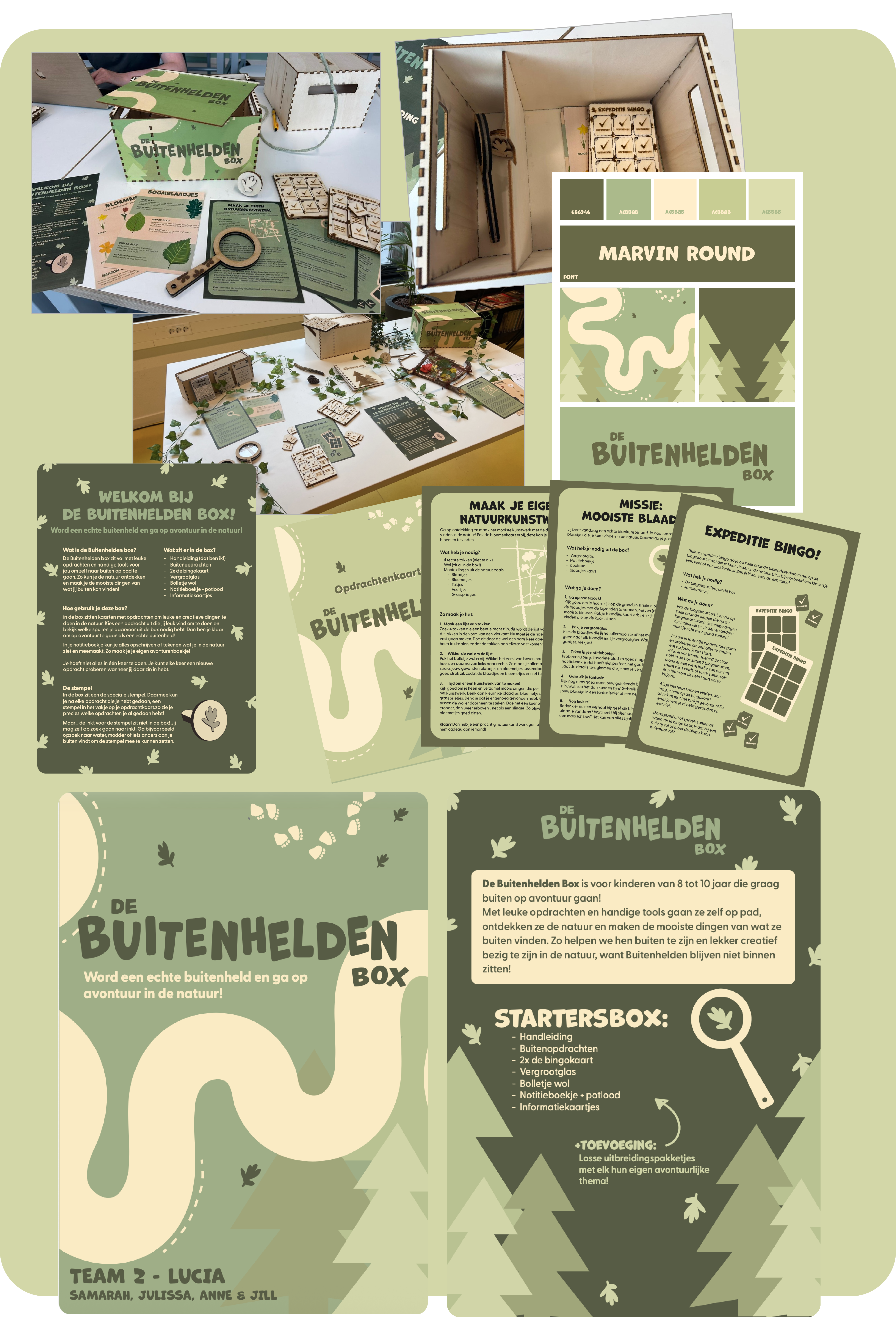 Na het onderzoek hebben we onze ideeën omgezet in een concreet concept voor de Buitenhelden Box. Zo hebben we bijvoorbeeld bepaald welke opdrachten en tools het beste aansloten bij onze doelen en doelgroep. Dit werkten we uit tot een eerste fysiek prototype, zodat het concept tastbaar werd en we het konden laten zien en testen aan anderen.