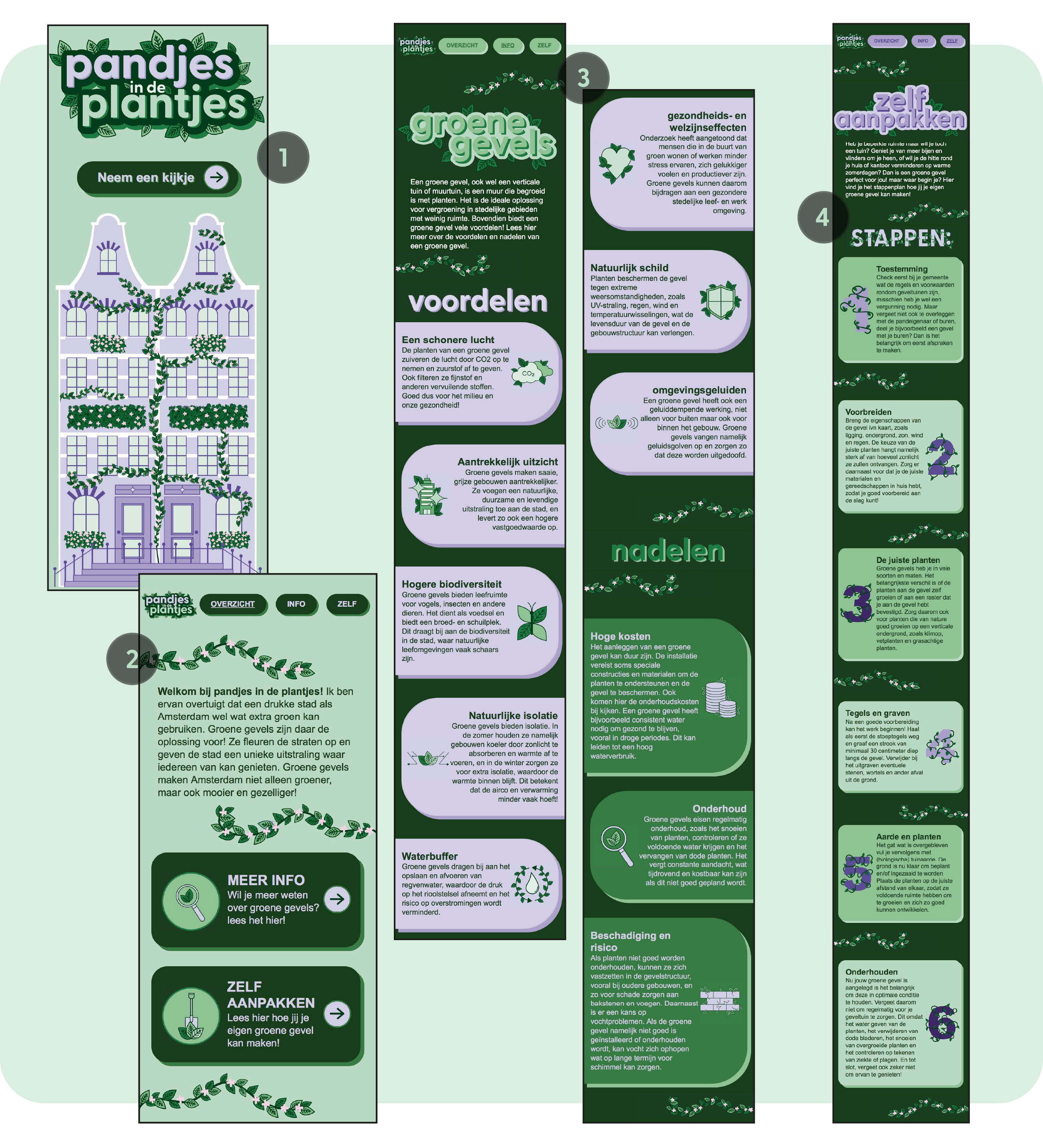 Voor project De Lieve Groene Stad ben ik aan de slag gegaan met een mobiele website waarin groene gevels centraal staan: Pandjes in de Plantjes. Ik ben er namelijk van overtuigd dat een drukke stad als Amsterdam wel wat extra groen kan gebruiken. Groene gevels zijn hier de oplossing voor! Op de website vind je meer informatie over groene gevels, lees je over de voordelen en nadelen, en krijg je tot slot een stappenplan waarmee je zelf aan de slag kunt met het maken van een groene gevel.