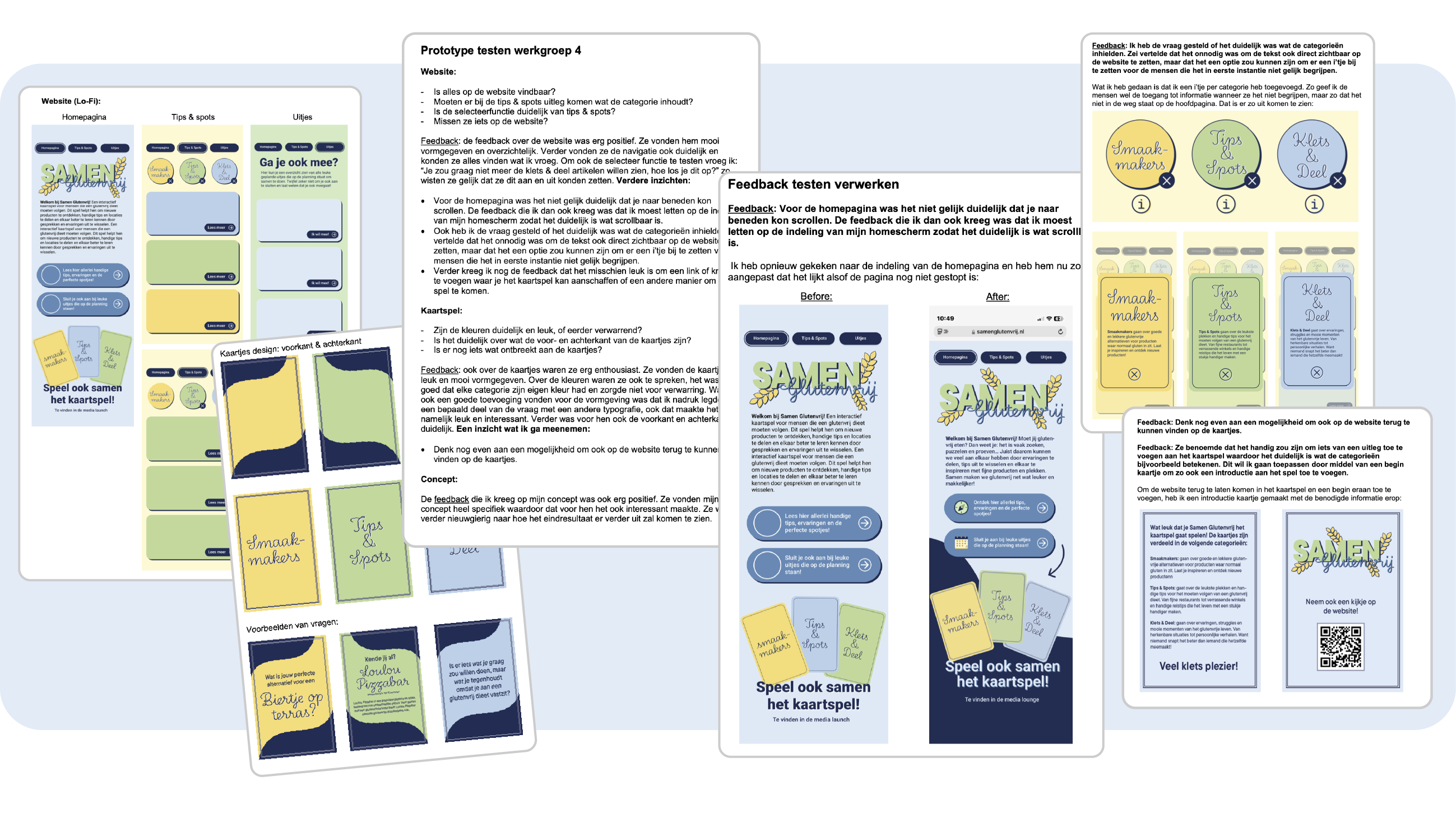 De ontwerpfase vond ik het leukste, omdat mijn website en kaartspel nu echt vorm kregen. Het kaartspel bestaat uit drie categorieën: “Smaakmakers” (om nieuwe producten te ontdekken), “Tips & Spots” (handige plekken en tips) en “Klets & Deel” (ervaringen delen en elkaar leren kennen). Daarnaast werkte ik de website eerst uit in een Lo-Fi prototype en testte dit met medestudenten en mijn community. Op basis van nieuwe feedback verbeterde ik het tot een Me-Fi prototype. Tot slot maakte ik de spelkaartjes fysiek en ontwierp ik ondersteunend materiaal, zoals een poster en visitekaartjes, voor de eindexpositie.
