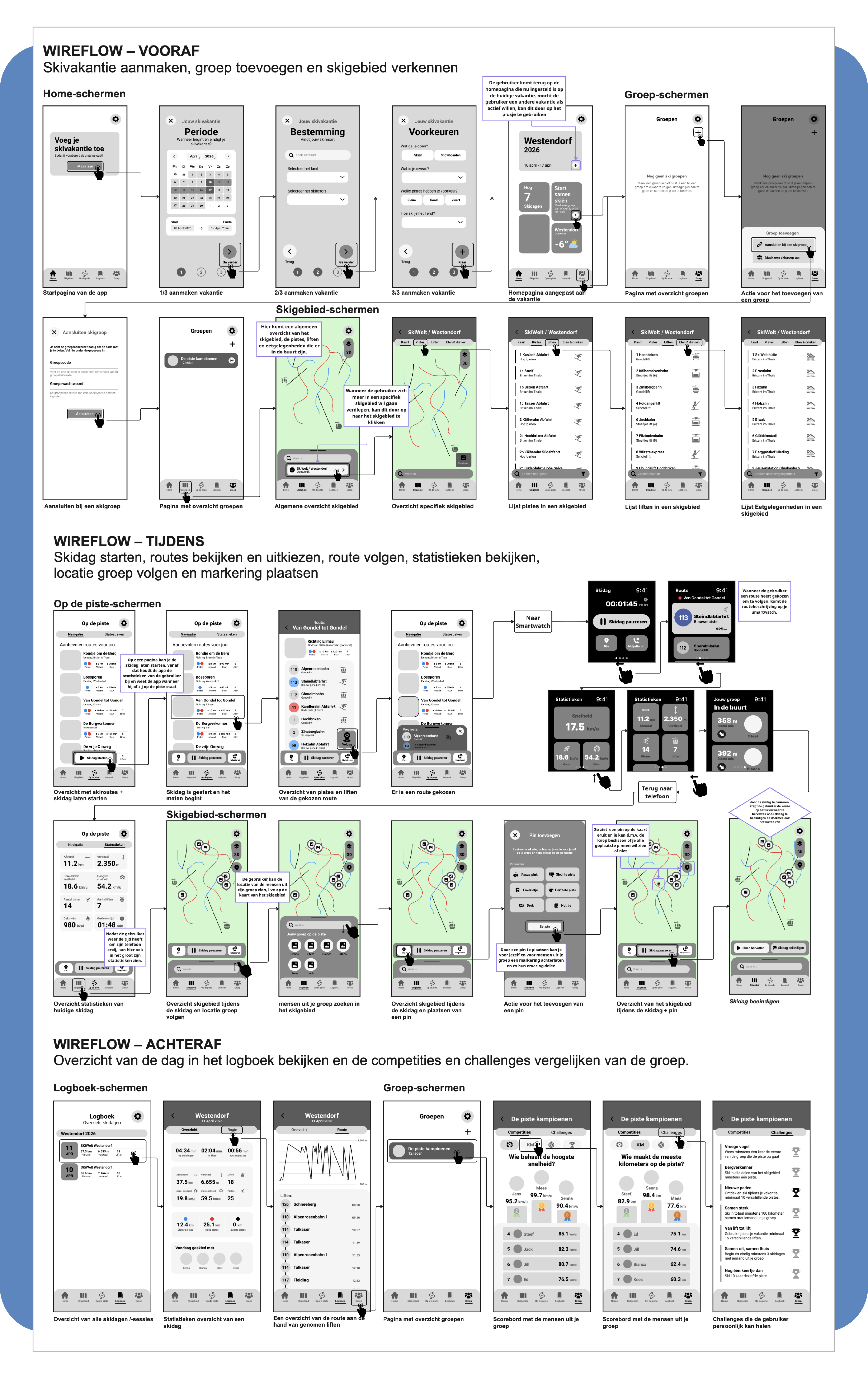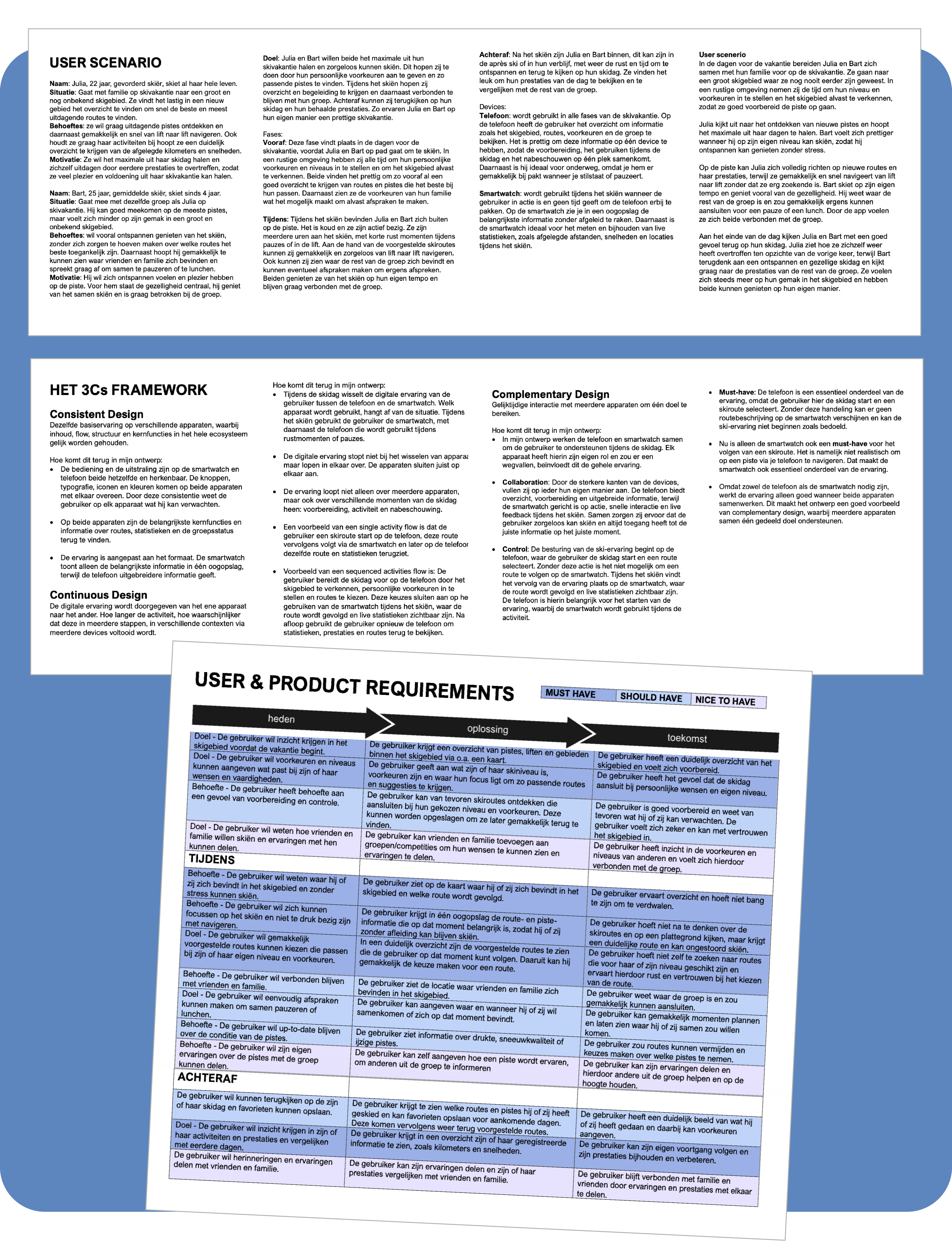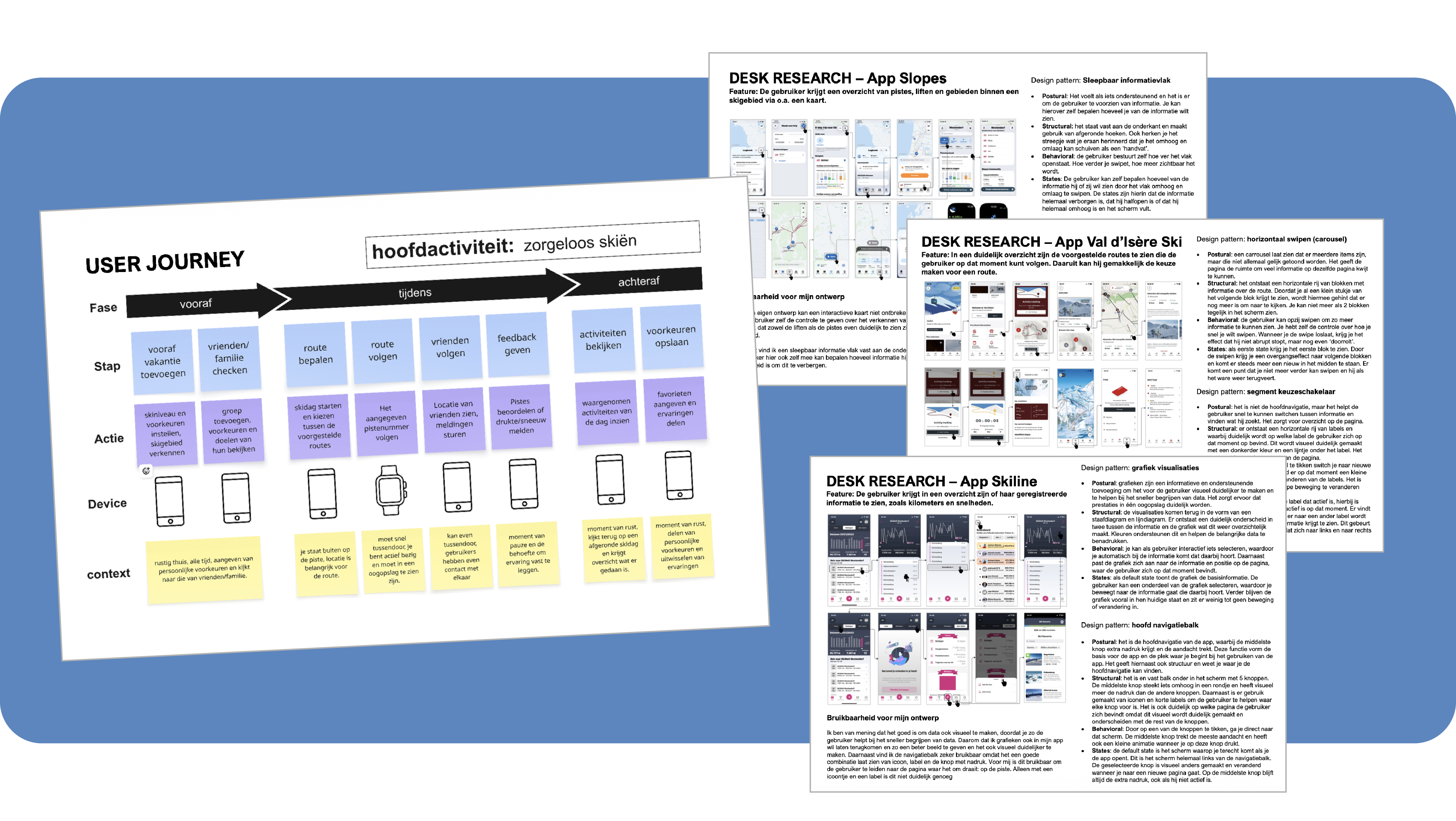 In de onderzoeksfase heb ik mijn idee voor de activiteit uitgewerkt in een user journey. Hierbij verdeelde ik de ski-ervaring in drie fases: voor, tijdens en na de activiteit. Per fase onderzocht ik welke stappen de gebruiker doorloopt en welke acties, devices en context daarbij horen. Door te kijken naar de omstandigheden, zoals op de piste, werd voor mij ook duidelijk wanneer de telefoon of smartwatch het meest geschikt is en waar rekening mee gehouden moet worden.