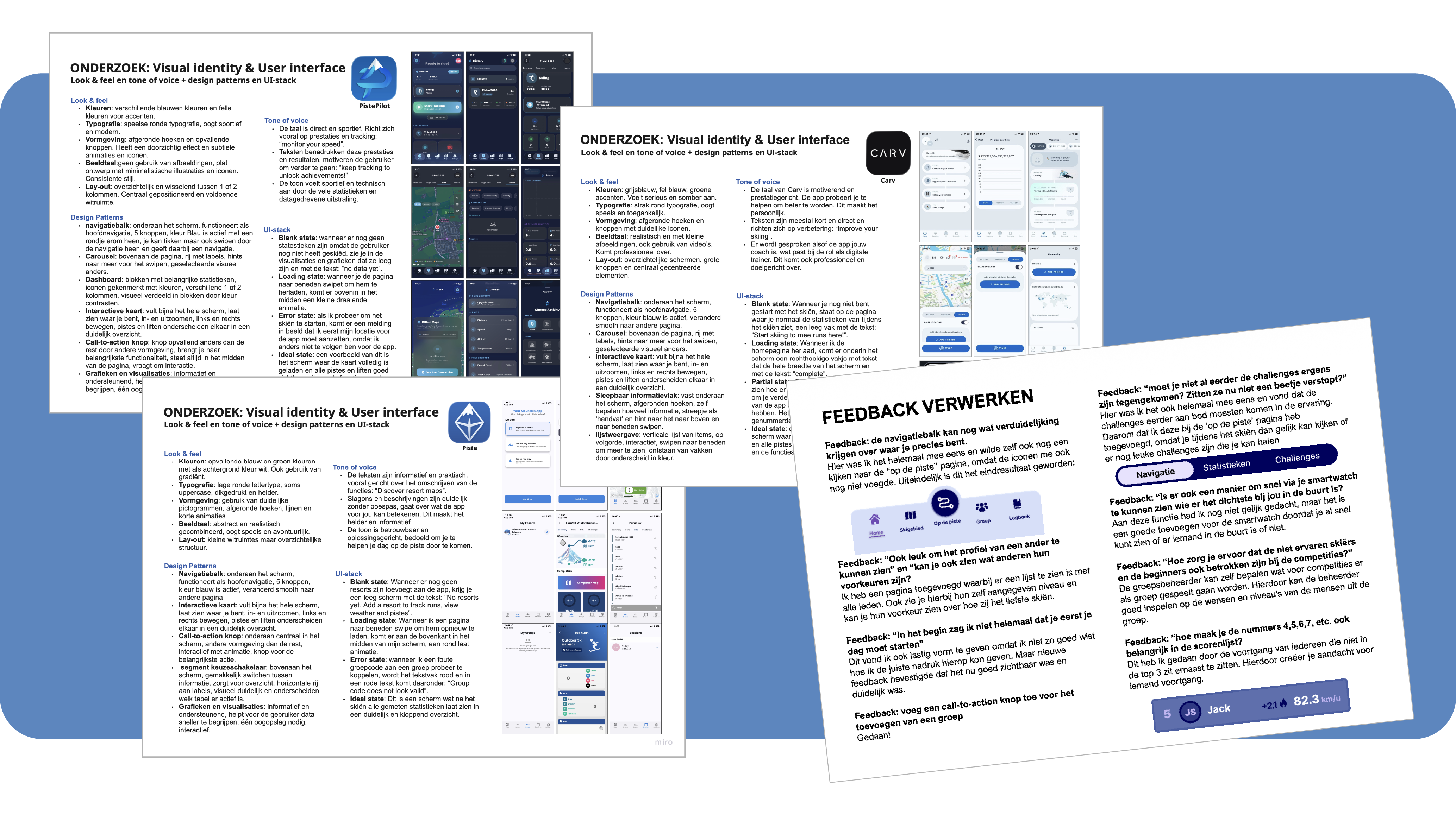 Voor de ontwerpfase deed ik aanvullend onderzoek naar bestaande digitale producten. Dit was onder andere een Visual Design onderzoek waarbij ik drie apps analyseerde die aansluiten bij mijn ski-ervaring. Ik keek naar de Look & Feel, zoals kleuren en typografie en ik keek naar de tone of voice. Daarnaast deed ik een User Interface onderzoek van dezelfde 3 apps waarbij ik lette op design patterns en ik schermen herkende van de UI-stack.